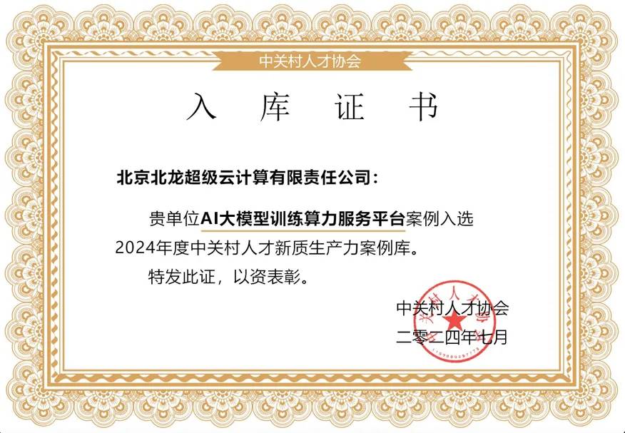 经过一系列严格的评审流程,由北京超算提报的“AI大模型训练算力服务平台”案例,成功入选“2024年度中关村人才新质生产力案例库”,通过创新的技术架构、优质的服务质量和先进的生产力水平,提高训练平台的性能和效率,支持更大规模、更复杂的AI模型训练,推动AI技术的广泛应用和落地发展,助力产业数字化转型,促进数字经济高质量发展。